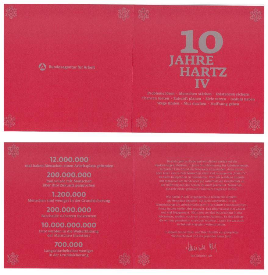Weihnachten steht vor der Tür und ebenso zehn Jahre Hartz IV. Ein Grund für die Bundesagentur für Arbeit, per Golddruck, eine hochglänzende Weihnachtskarte an die Parteien, Fraktionen und Abgeordneten des Bundestages zu versenden. Dass Rot-Gold zu Weihnachten Tradition hat, kann als gegeben hingenommen werden. Dass nun aber Zahlen als Erfolgskolonnen per Weihnachtsgruß versendet werden, mutet zynisch und befremdlich an. So haben „12.000.000 mal Menschen einen Arbeitsplatz gefunden, 200.000.000 wurde mit Menschen über ihre Zukunft gesprochen, 1.200.000 Menschen sind weniger in der Grundsicherung, 200.000.000 Bescheide sicherten Existenzen, 10.000.000.000 Euro wurden in die Weiterbildung der Menschen investiert und 700.000 Langzeitarbeitslose weniger sind in der Grundsicherung.“ Zwar gibt die Bundesagentur für Arbeit zu, dass zehn Jahr Hartz IV kein Grund für ein Feuerwerk seien, jedoch durchaus ein denkwürdiges Jubiläum. Ähnliches findet sich in der Mitarbeiterzeitschrift „Dialog“ wider. Heinrich Alt, Vorstand der BA, resümiert die letzten zehn Jahre. Dabei stellt er fest, „dass der Start alles andere als brillant war. Er war viel zu hektisch und unvorbereitet.“ „Es gab keine geschulte Mannschaft“ und verliert sich im Bild einer Fußballmannschaft, „die aus zwei Teams unterschiedlicher Verwaltungskulturen kamen. Plötzlich hatten alle das selbe Trikot an und rannten auf das selbe Tor zu.“ (…) Eine Mannschaft schießt so auf diese Weise ständig Eigentore. Diese sind schnell zu finden, wenn wir uns auf den prekären Arbeitsmarkt, insbesondere der Zeit- und Leiharbeit fokussieren. Der kleinste Teil dieser Arbeitnehmer bleibt im festen Arbeitsverhältnis. Der größere Arbeitnehmerteil kommt in den Strafraum der Jobcenter, und wird dort ins Abseits gestellt. Mit Glück schießt der Abwehrspieler, hier das Jobcenter, keine Sanktion zurück.
