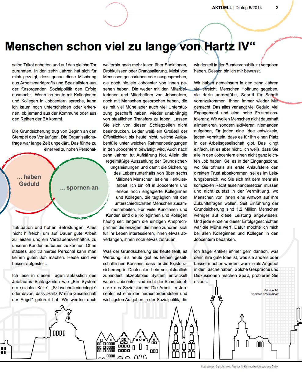 Alt moniert Schlagzeilen wie „Ein System der sozialen Kälte“, „Sklavenhalterideologie“ und dass „Hartz IV eine Gesellschaft der Angst“ geformt hat. Auch ist ihm bewusst, „dass er weiterhin noch mehr über Sanktionen, Drohkulissen oder Drangsalierung“ lesen wird. Dabei stellt er fest, „dass dieses meist von Menschen geschrieben oder ausgesprochen wird, die noch nie ein Jobcenter von innen gesehen haben. Die weder mit den Mitarbeiterinnen und Mitarbeitern von Jobcentern gesprochen haben. Er rät den Mitarbeitern, dass sie sich von diesen Schlagzeilen nicht beeindrucken lassen sollen. Und bis heute weiß ein Großteil der Öffentlichkeit nicht, welche Aufgabenfülle unter welchen Rahmenbedingungen in den Jobcentern bewältigt wird.“(…) In einem Punkt gebe ich Alt recht: „Auch nach zehn Jahren tut Aufklärung Not.“ Aufklärung heißt, dass gerade die hohe Anzahl an Beschwerdebriefen, die Suche nach Antworten in den Foren, die zahlreichen Schicksalsberichte von Betroffenen, die Kritik der Gewerkschaften, Parteien, (Sozial)- Verbänden, Wissenschaftlern aber auch von den Mitarbeitern aus den Jobcentern und den Personalräten gehört und ernstgenommen werden. Menschen, die mehrheitlich vor Ort in den Jobcentern als Betroffene oder Mitarbeiter sind. Dass das Internet für Alt „Neuland“ ist, ist genauso unglaubwürdig, wie die Aussage selbst. Betroffene werden und sind durch Hartz IV ins Abseits gestellt. Aber eigentlich sind wir ja bei Weihnachten und die Arbeitslosengeld-II-Berechtigten haben mit Sicherheit kein Weihnachtsgeschenk von der BA erhalten. Stattdessen müssen sie schauen, wie sie von monatlichen 391 Euro noch irgendwie ein paar Cent zurücklegen, um zumindest eine Weihnachtskarte an ihre Verwandten oder Freunde zu senden. Davon sind auch 1,6 Millionen Kinder im Hartz IV-Bezug betroffen. Das ist keine frohe Weihnachtsbotschaft. Es ist die Realität, wenn für viele Menschen der Weihnachtstag zum Schamtag wird. Hartz IV ist eine katastrophale Fehlentscheidung von Schiedsrichtern, die sich BA und Bundesregierung nennt.