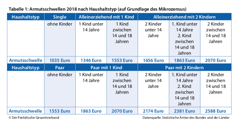 „Das Erfreuliche zuerst: Die Armut in Deutschland ging von 2017 auf 2018 zurück“, so der Paritätische Gesamtverbandes in seinem Armutsbericht, der am 12. Dezember veröffentlicht wurde. Dem Bericht zufolge lag die Armutsquote 2018 im Bundesdurchschnitt bei 15,5 Prozent. Das waren 0,3 Prozentpunkte weniger als 2017. Die Quote ging erstmals seit 2014 zurück. Trotz guter Konjunkturlage ist die Armutsquote knapp ein Prozentpunkt höher als vor zehn Jahren. Der Paritätische stützt sich dabei auf den Mikrozensus des Statischen Bundesamtes. Es gelten demnach diejenigen als einkommensarm, deren Einkommen unter 60 Prozent des mittleren Einkommens liegt. Dabei wird das gesamte Nettoeinkommen des Haushaltes, wie Kindergeld, Wohngeld, Kinderzuschlag oder sonstiges Einkommen berücksichtigt. Damit liegt die Armutsschwelle 2018 für eine alleinstehende Person bei 1.035 Euro, für einen Haushalt mit zwei Erwachsenen und zwei Kindern unter 14 Jahren bei 2.174 Euro. Alleinerziehende mit zwei Kindern gelten als armutsgefährdet bei einem Einkommen bis zu 1.656 Euro und mit einem Kind bis zu 1.346 Euro.