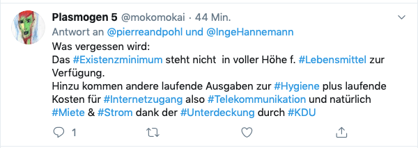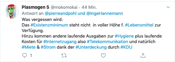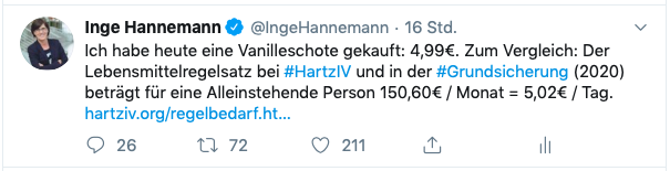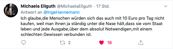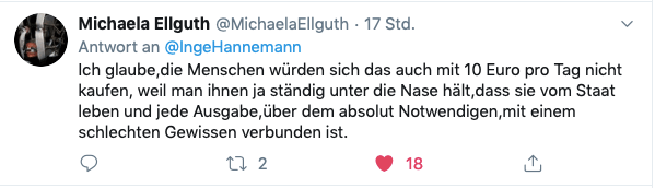 Hartz IV und die Grundsicherung, die den Ruf besitzen, das Existenzminimum zu sichern, werden mit diesem Tweet demaskiert. Gleichzeitig mutiert eine Vanilleschote zu Luxus, genauso wie Hund und Katze – schreibt „Piderschneider-Uschi“. Ist es jetzt Ironie, dass eine Vanilleschote, ein Hund und eine Katze zum Luxus gehören? Oder, dass der Vergleich mit der Vanilleschote hinkt, weil es eben Luxus ist? Es scheint keinen Zweifel daran zu geben, dass etwas Aroma genau dieses ist. Und es geht darum, dass etwas Luxus sowieso nicht nötig ist. Und ich bleibe mit der Frage zurück: Wann war der Zeitpunkt, dass ein wenig Luxus hinkt? Dass eine Vanilleschote unnötig ist und es eine Selbstverständlichkeit ist, dass Sozialleistungsberechtigte dieses nicht in ihrem Repertoire haben? Oder, wie es Michaela schreibt: „jede Ausgabe, über dem absolut Notwendigen, mit einem schlechten Gewissen verbunden ist“.